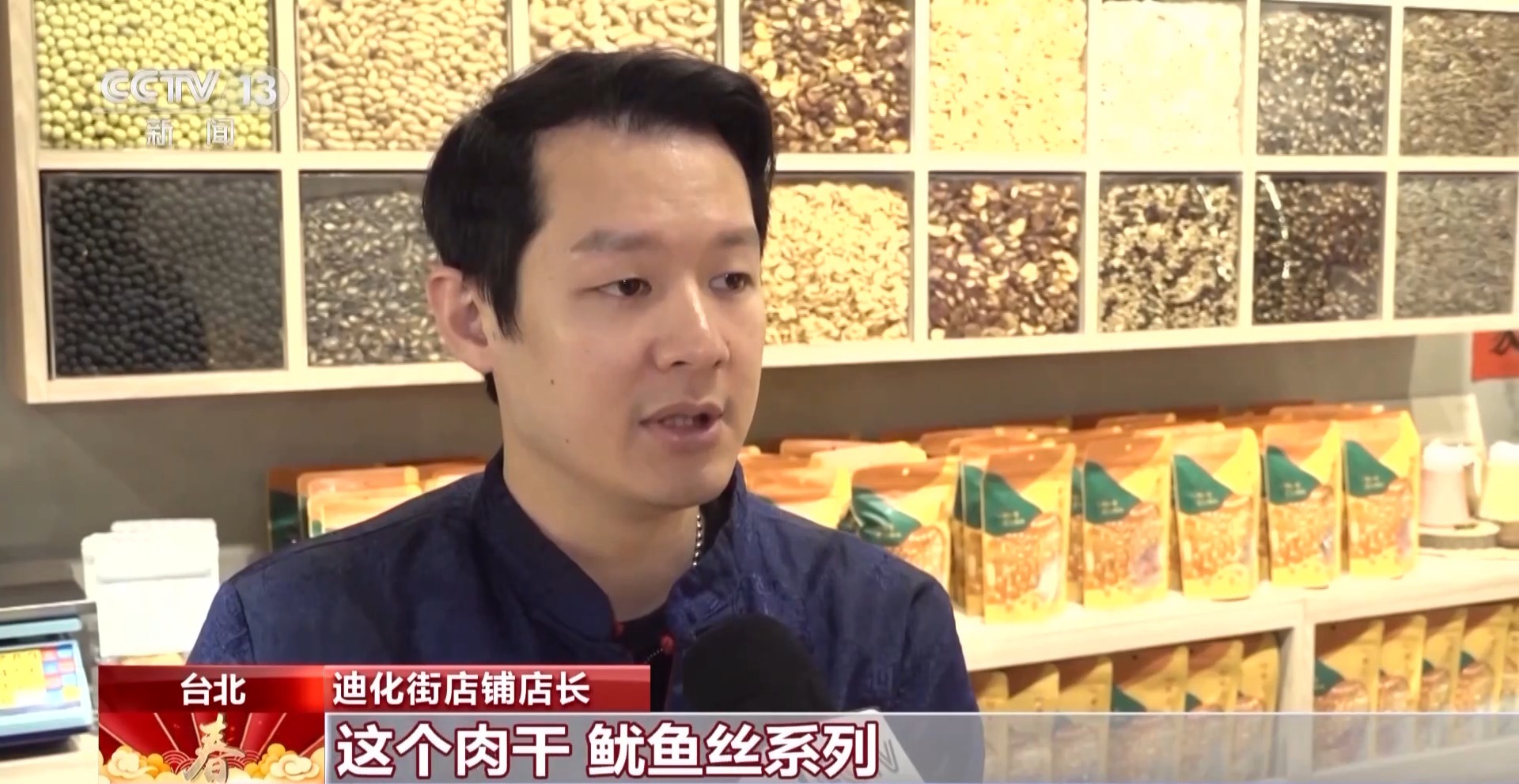 迪化街店铺店长:春节时期大部分东谈主家会选拔这个肉干、鱿鱼丝系列,还有咱们摆放漂亮的糖果系列为主要的采购商品。